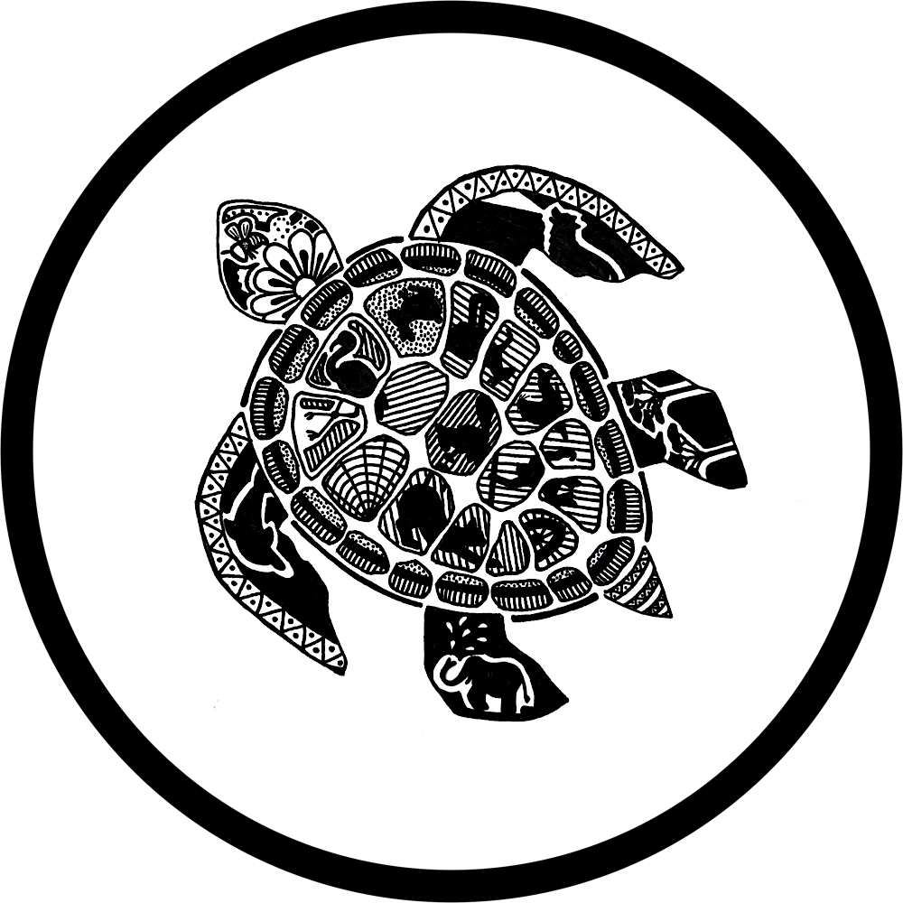 SEA TURTLE(ウミガメ)をモチーフにしたデザインです。ウミガメの甲羅を動物園に見立てて沢山の動物を描いた可愛らしいイラストです。