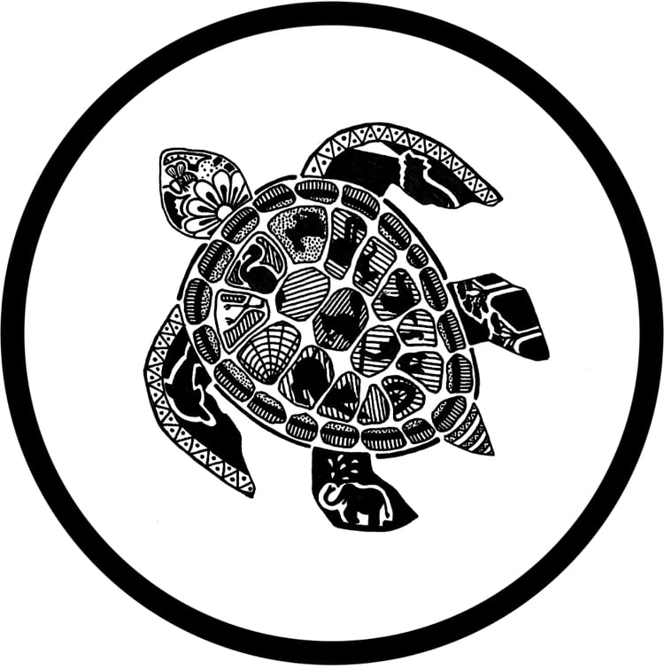 SEA TURTLE(ウミガメ)をモチーフにしたデザインです。ウミガメの甲羅を動物園に見立てて沢山の動物を描いた可愛らしいイラストです。